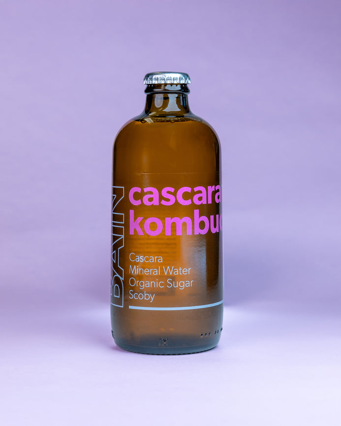BAIN Cascara Kombucha A beautiful Colombian cascara from Argote and friends; it’s bright and warming on the pallet with a journey of flavour notes of caramel, tamarind and pomegranate and the subtlest sweetness of citrus blossom and honey