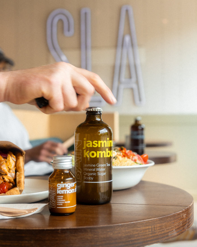 BAIN Jasmine Kombucha has an elegant brightness with mild floral notes. Its pleasant lemon-like acidity is perfectly balanced with a subtle sweetness. A deliciously refreshing, light-bodied non-alcoholic beverage.